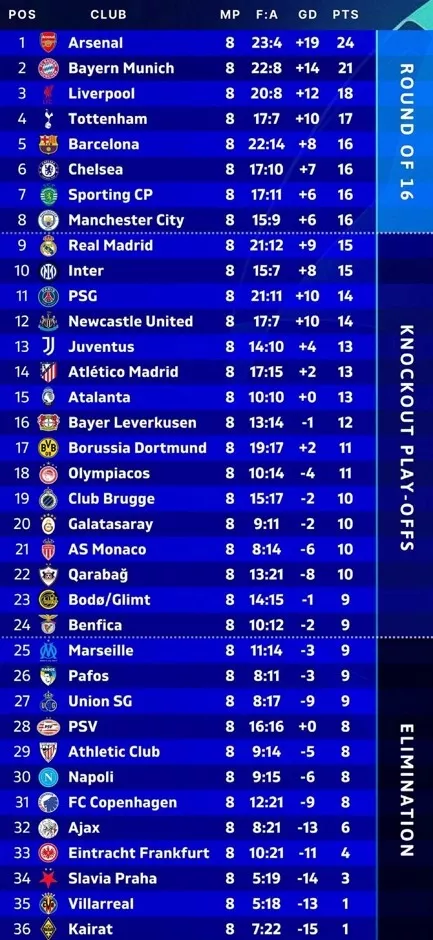 В стыковых матчах за право играть в 1/8 финала Лиги чемпионов сыграют «Реал», «Интер», «ПСЖ», «Ньюкасл», «Ювентус», «Атлетико», «Аталанта», «Байер», «Боруссия» Дортмунд, «Олимпиакос», «Брюгге», «Галатасарай», «Монако», «Карабах», «Буде/Глимт» и «Бенфика».